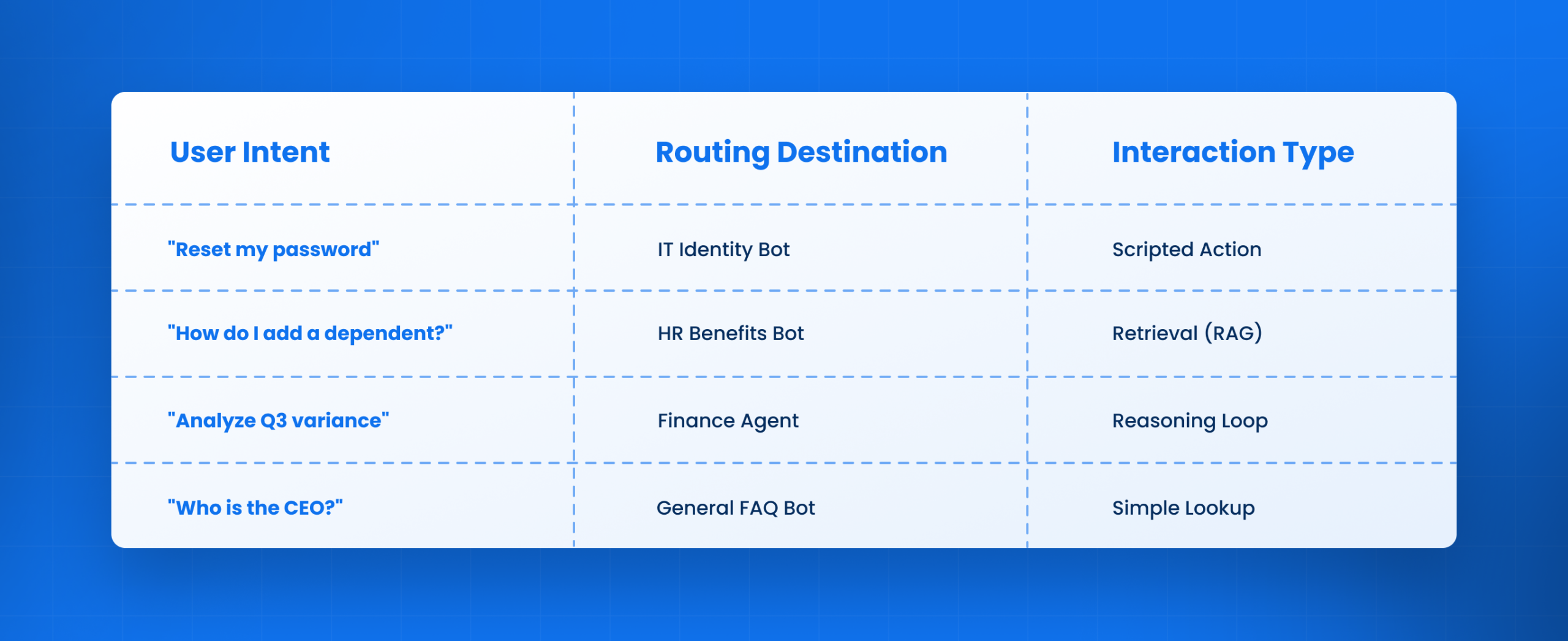 - Intent Classification: Map specific intents (e.g., “Change Address”) to specific backend owners (e.g., Workday).
