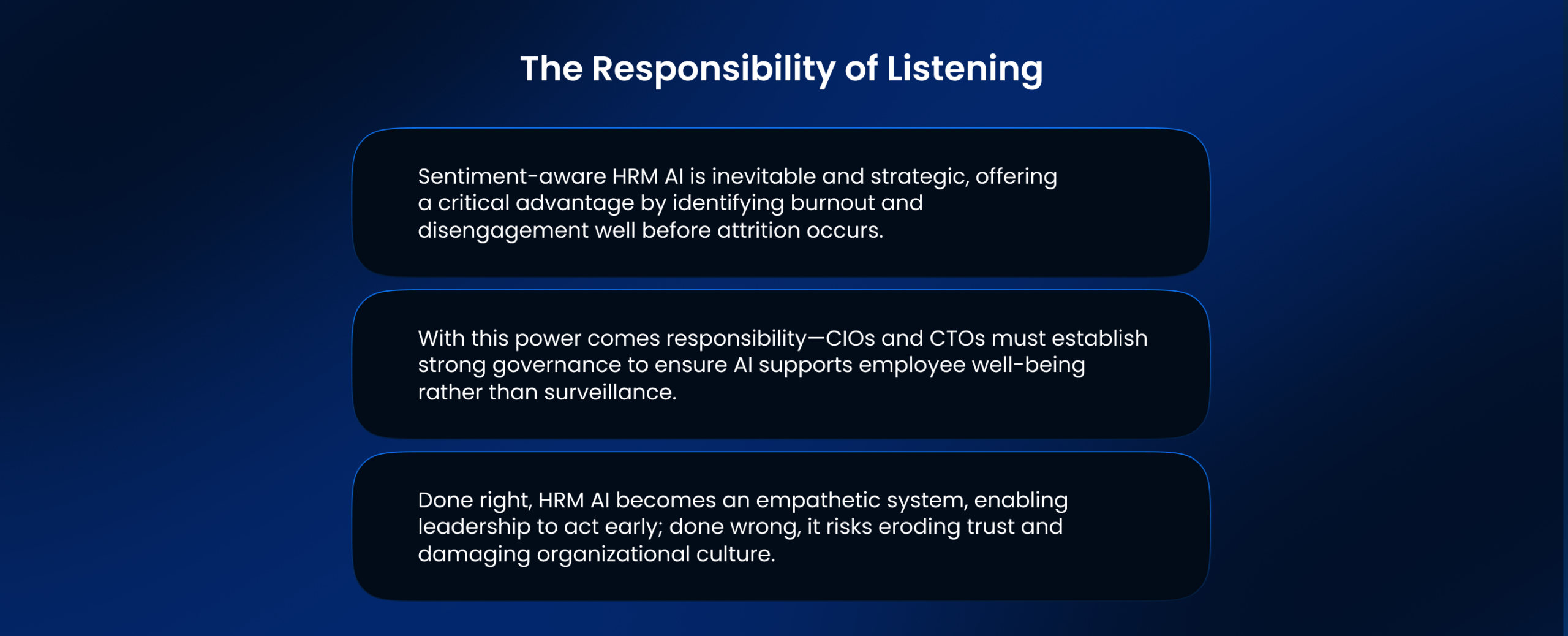 As technology leaders, we need to talk about the governance of HRM AI as a listening engine. Using AI to predict attrition is not a technical problem anymore; it is an ethical and operational minefield.